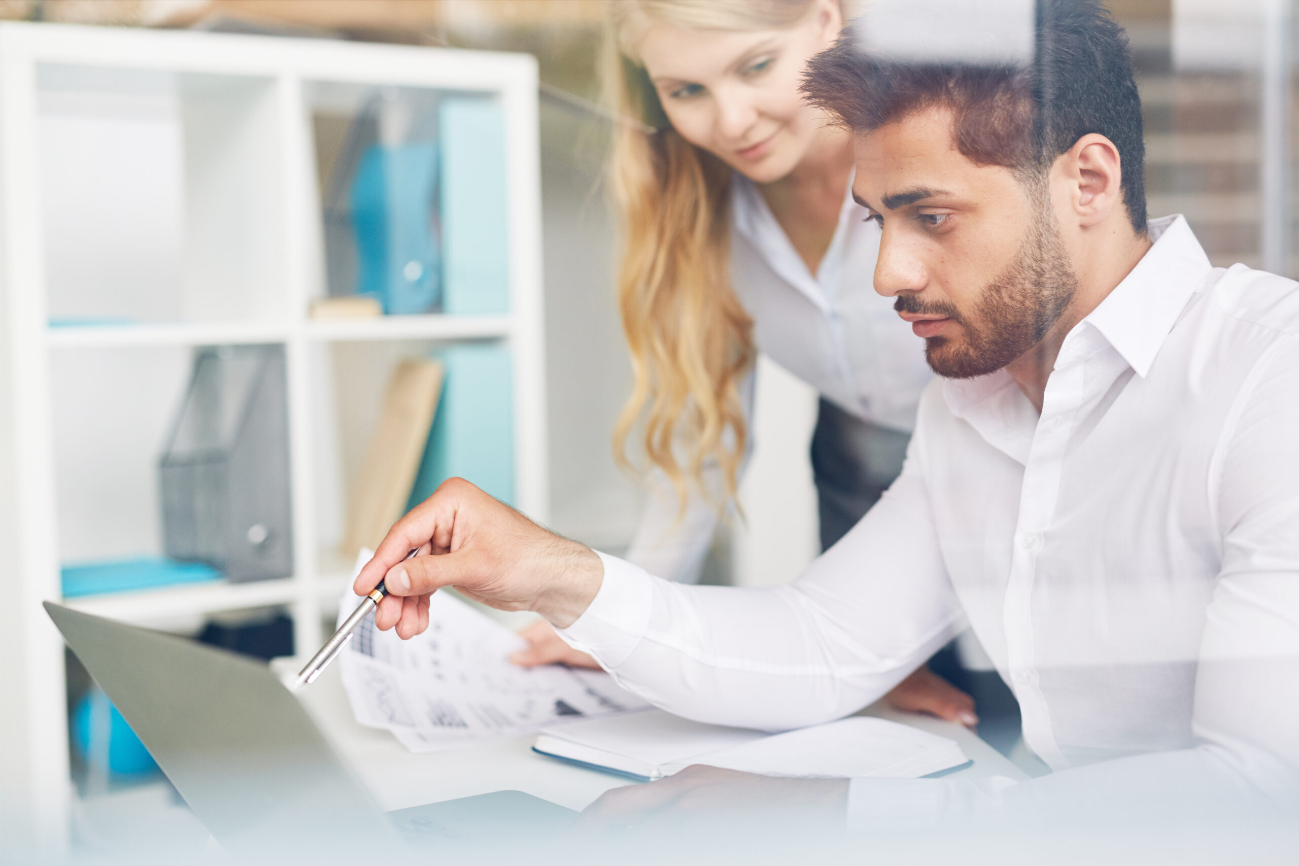 Businessman with pen pointing at laptop display while explaining important data to colleague or employee